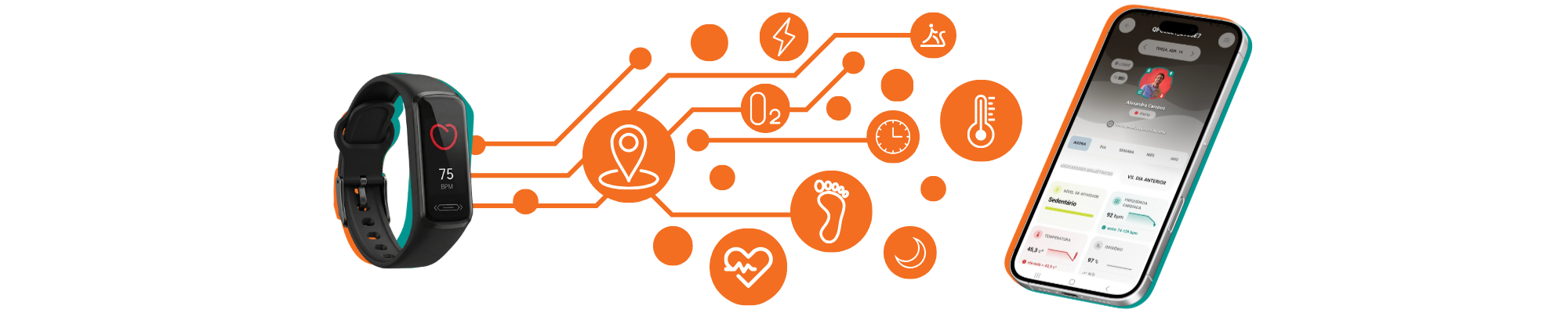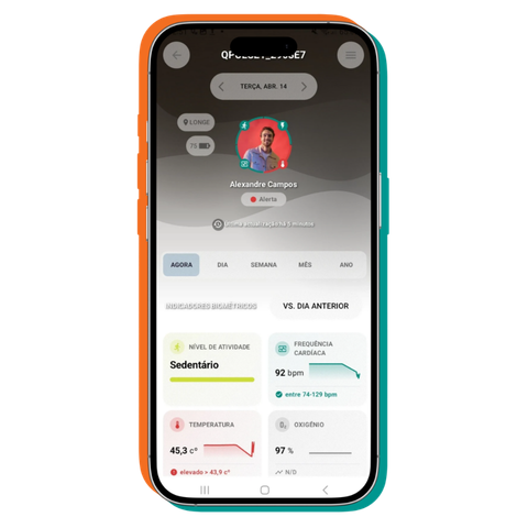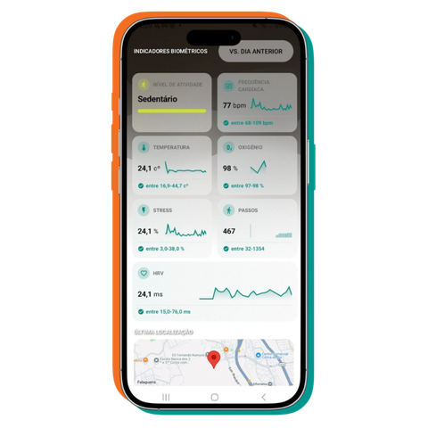 Acompanhe indicadores de bem-estar, atividade, localização e alertas em tempo real, com visualização centralizada na app Quatenus MyPulse.