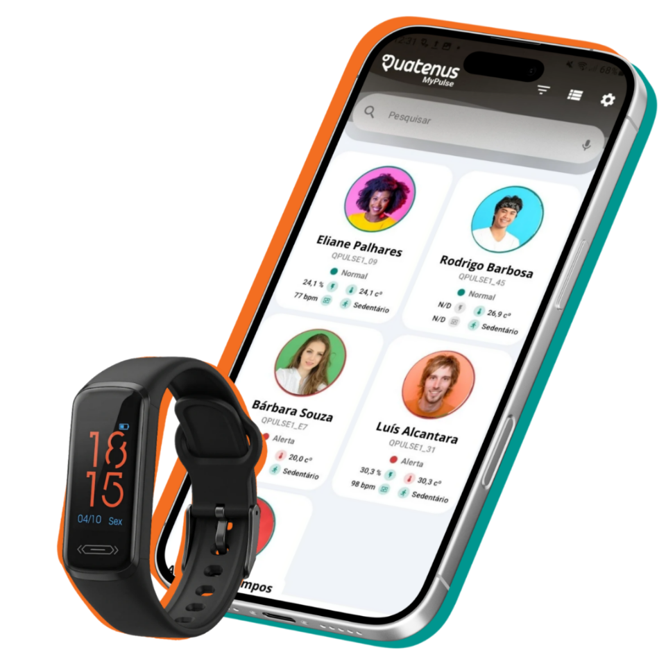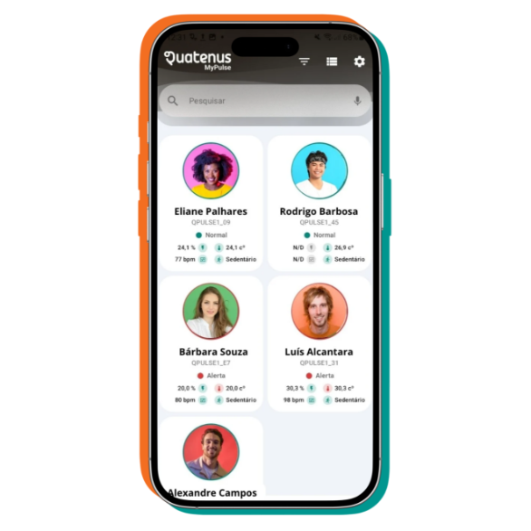 Os dados recolhidos são apresentados na app Quatenus MyPulse, onde a gestão consegue consultar o estado de cada utilizador, visualizar indicadores relevantes e acompanhar alertas de forma simples e centralizada.